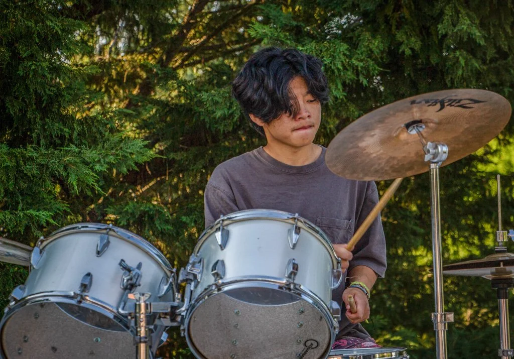 Hung strikes the drums while the band rehearses covers of “Transparent Soul” by Willow, “Freaks” by Surf Curse, “Blitzkrieg Bop” by The Ramones, and more.
