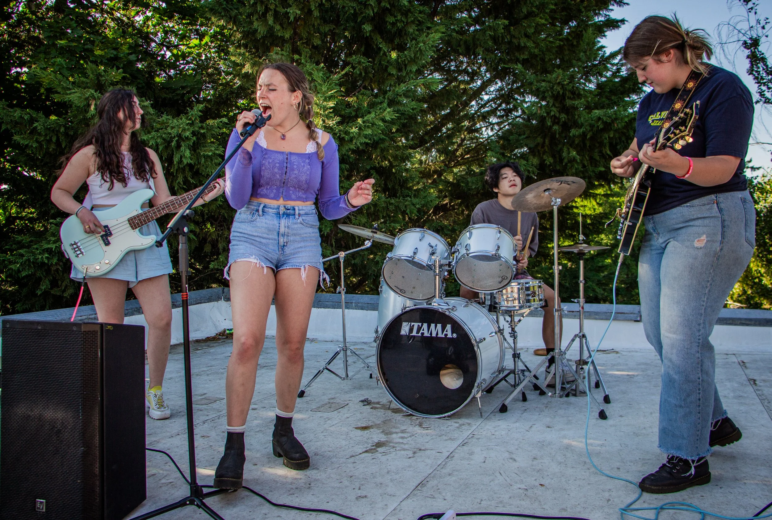 The Pink Door hosts their practice on a rooftop patio above the Delta Tau Delta Fraternity House. The band consists of Claire Jenkins, bassist; Emily Bullinger, lead singer; Brian Hung, drummer; and Ella Nixon, guitarist.